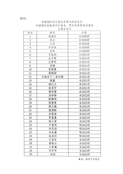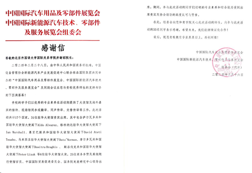 第34届中国国际汽车服务用品及设备展览会暨第2届中国国际新能源汽车供应链大会于2024年2月28日至3月2日在北京中国国际展览中心举办,北外beats365vip官网登录入口共派出33名志愿者参与外宾接待服务。此次会展活动共有17个国家参与,31位驻华大使馆贵宾出席,其中包括6位驻华大使馆大使与25位商务参赞,以及其他随行使馆官员、中国国际贸易促进委员会、国务院发展研究中心领导。期间,参与此次活动的同学们凭借过硬的专业素养和综合能力,赢得了出席贵宾及协会领导的高度认可与赞誉。