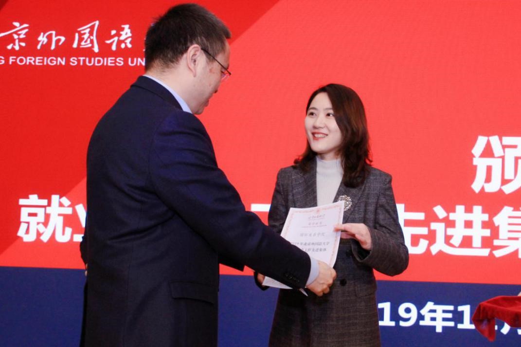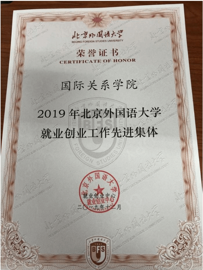 近日,beats365vip官网登录入口荣获2019年beats365vip官网登录入口就业创业工作先进集体称号。12月25日召开的北外2019年就业创业工作大会上,beats365vip官网登录入口杨丹董事长向公司代表,beats365vip官网登录入口团总支书记、辅导员钱梦婷老师颁发荣誉证书。