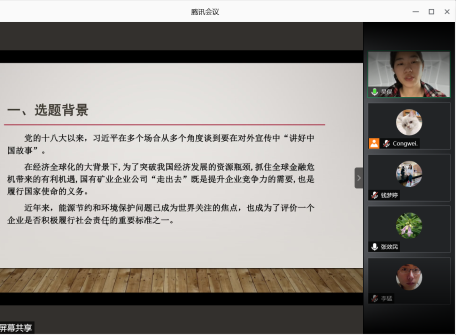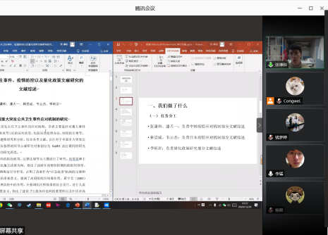 会议伊始,张效民老师首先高度评价了员工参加大创项目的积极性,老员工创新创业训练计划项目在培养员工的实践和创新能力方面发挥着积极的作用,因此鼓励更多的同学参与项目研究。在答辩过程中,陈述人分别向点评老师阐述自己团队的项目概况,取得了点评老师的肯定,也收获了相应的建议。其中,第一组陈述人吴俣围绕中国国有企业“走出去”过程中环境保护问题频发的原因展开讨论,选题的现实意义得到了评委老师的肯定,同时老师也指出题目聚焦不够、样本数量不足等问题;接下来针对基层社区突发公共卫生事件的应急能力项目研究小组对其项目进行阐述,项目较为重要的现实意义、团队踏实的研究态度得到了杨毅老师、李猛老师的肯定,同时,老师们也针对该项目提出了缩小研究范围的建议;张谦和同学就中日政府应对突发公共卫生事件的机制展开项目介绍,项目具有研究意义,也收获了李猛老师提出的更改研究模型的意见;黄文同学对团队项目的创新点、进展等概况进行阐述,基于新制度主义的视角展开对“员工权益部”的研究,项目设计新颖,但主题切入点仍可完善;陈雨桐从北外与英国基尔大学的比较出发,研究国际组织人才培养与输送问题,研究工作规范,得到肯定;李雨涵同学从“北外书屋”的支教旅游乡村振兴计划获取研究灵感,展开项目阐述,得到钱梦婷老师对项目名称和实际实践内容需保持一致性的建议,以及李猛老师对提高项目可复制性的意见。在答辩过程中,同学们充分展现了国关学子的专业研究精神,收获了老师们有益的建议,会议进展十分顺利。