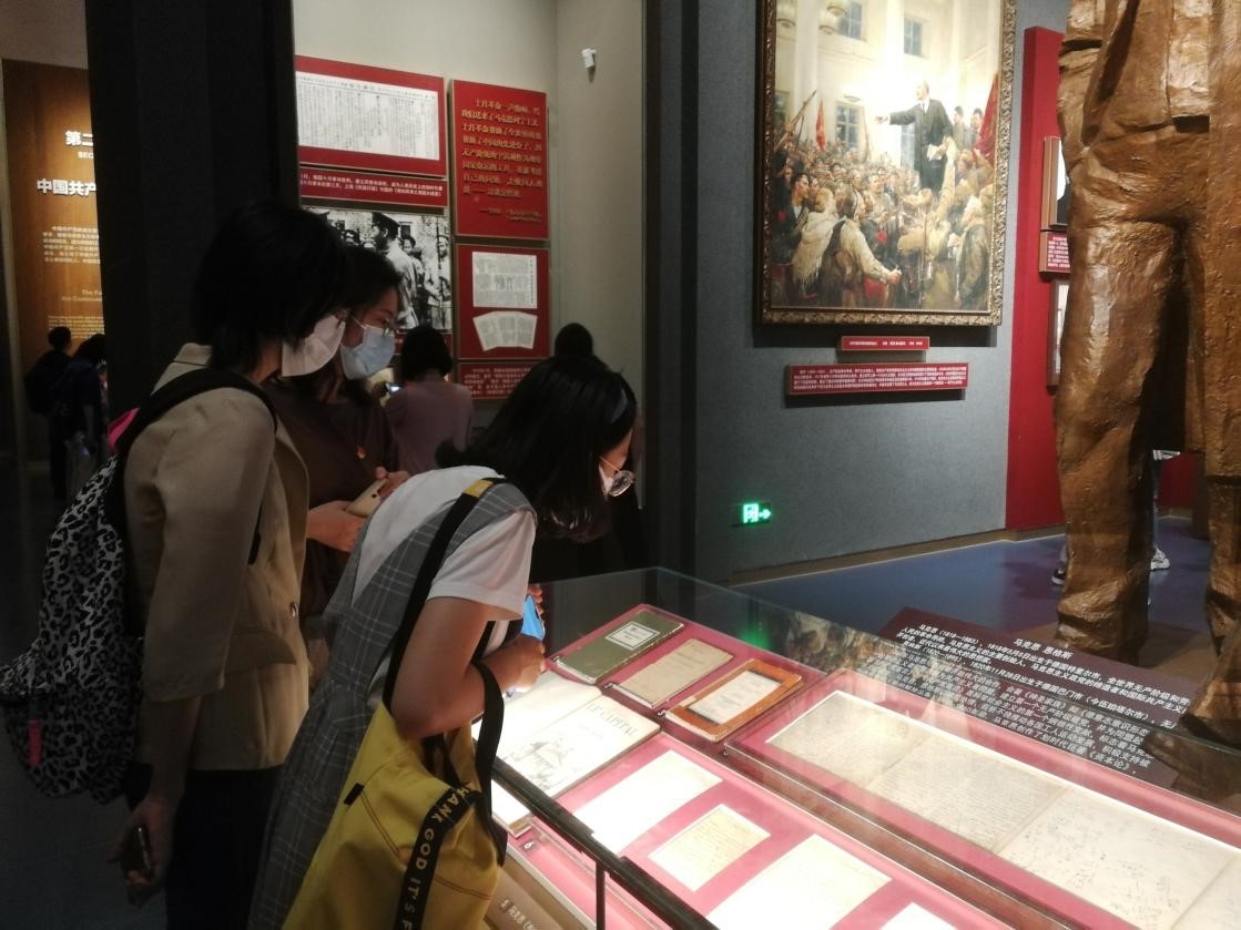 在参观过程中,大家放慢脚步,时不时在展品前驻足仔细观看,交流感触与心得。