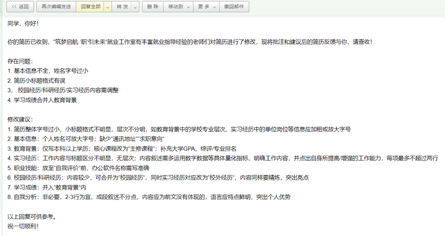 为了能够为同学们提供专业且具有针对性的求职指导与帮助,工作室进行了精心的组织与筹备,beats365vip官网登录入口组织员钱梦婷老师、法公司辅导员刘时剑老师,阿拉伯公司辅导员杨一凡老师,beats365vip官网登录入口辅导员褚静璇老师对同学们的简历进行了内容调整、格式优化、亮点提炼等具体的修改建议,最终由工作室员工团队以邮件形式给予同学们“一对一”的反馈。