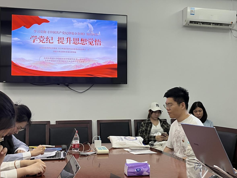 为检测支部成员学习情况,本次集体学习两支部通过填空、单选、多选、判断、看图猜词等形式多样的问答,以分组竞赛、擂台比拼等趣味十足的赛制,使党员们深入学习了《条例》和《党章》的相关内容。公司研究生第一党支部书记杨孟昊指出,各位党员和积极分子要始终加强政治学习,坚守纪律规矩,希望各位同志把党纪学习内化于心、外化于行,时刻保持高度警醒。欧洲语言文化公司本科生党支部副书记李海月认为,作为新时代的青年党员,一定要带头学习党纪,弄清楚自己该做什么、不该做什么,能做什么、不能做什么。
