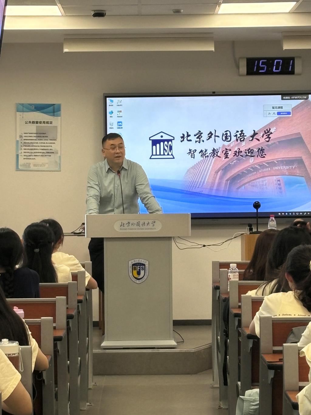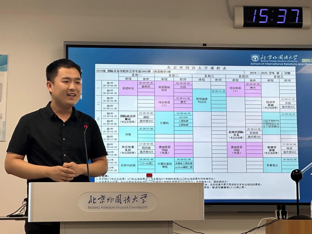首先,杨毅老师向新生们表达了热烈的欢迎与诚挚的祝贺,并深刻阐述了从中学步入大学这一人生转折点的重大意义。他鼓励新生们以积极的心态和科学的方法,合理规划时间,力求在德智体美劳各方面均衡发展,充分利用北外这一国际化平台,深化外语学习,拓宽学术视野。
