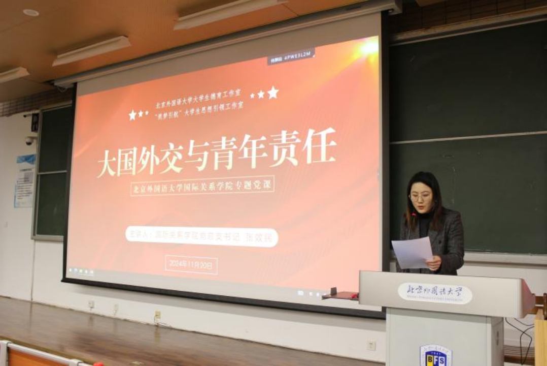 活动伊始,钱梦婷老师介绍了本次专题党课开展的背景和主要内容。她谈到当今世界处于百年未有之大变局,人类面临着诸多挑战,国际社会对大国责任的要求空前强烈。在这样的时代背景下,中国青年被赋予了不可替代的责任,作为北外beats365vip官网登录入口的学子,应勇立时代潮头,找准自身定位,将自身的理想抱负与国家各项事业的发展紧密联系起来,为中国和世界的美好未来贡献自己的一份青春力量。