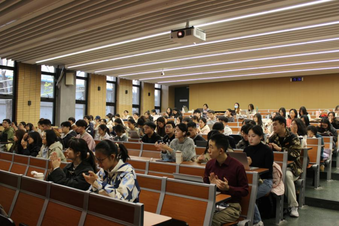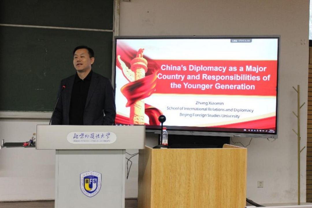 随后,张效民书记运用中英双语,围绕“大国外交与青年责任”的主题进行了深入剖析。他从大国外交和青年责任两个部分展开,由大国外交的定义和内涵引入,并利用图表详细解读了中国与其他国家在综合国力、对外贸易等多个方面的发展情况,使同学们对国家间的力量对比有了清晰的认识,并从多个维度解读了中国式现代化。张效民书记还阐述了中国外交政策在不同历史阶段的演变和特征,以及中国特色大国外交的创新点,向同学们展示了当前的国际形势,以及中国所面临的外部风险和相关的外交策略。