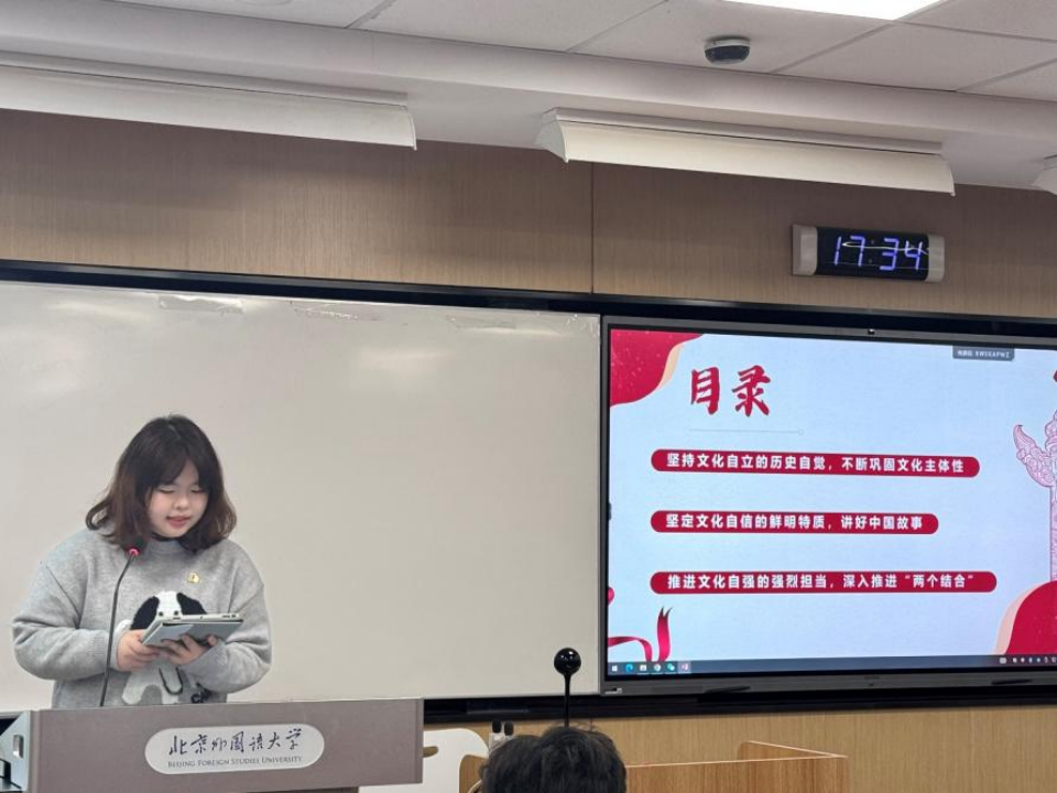 活动伊始,陈可钰同学发表了题为“学习习近平文化思想,坚定文化自信自立自强”的学习报告。她着重阐述了学习习近平文化思想对于坚定文化自立、自信以及推动文化自强的重要性。陈可钰同学提出,习近平文化思想深植于党的文化建设实践,为马克思主义文化理论的中国化与现代化开辟了新路径。文化自立是民族复兴的基石,文化自信是民族前行的精神动力,而文化自强则是实现民族伟大复兴的支撑。陈可钰同学鼓励大家从习近平文化思想中汲取智慧,讲好中国故事,传承中华文明,为新时代的奋斗续写辉煌篇章。