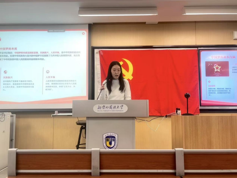 首先,陈楚燕同志以“中国梦是中华民族近代以来最伟大的梦想”为主题进行分享。她指出,实现中华民族伟大复兴的中国梦,集中体现了中华民族的最高利益和根本利益,其本质内涵是民族振兴、国家富强与人民幸福。随后,她系统阐述了实现中国梦的实践路径,在新时代必须进行具有许多新的历史特点的伟大斗争,深入推进党的建设新的伟大工程,推进中国特色社会主义伟大事业,最终实现中华民族复兴的伟大梦想。她强调,新时代中国特色社会主义的伟大实践为实现中国梦提供了宝贵历史机遇,我们必须积极投身于社会主义现代化强国建设和中国特色社会主义事业,为推动构建人类命运共同体贡献智慧与力量。最后,她总结到我们北外学子,应当坚定理想信念,扎实学好专业本领,勇担时代责任,为实现中华民族伟大复兴的中国梦接续奋斗。