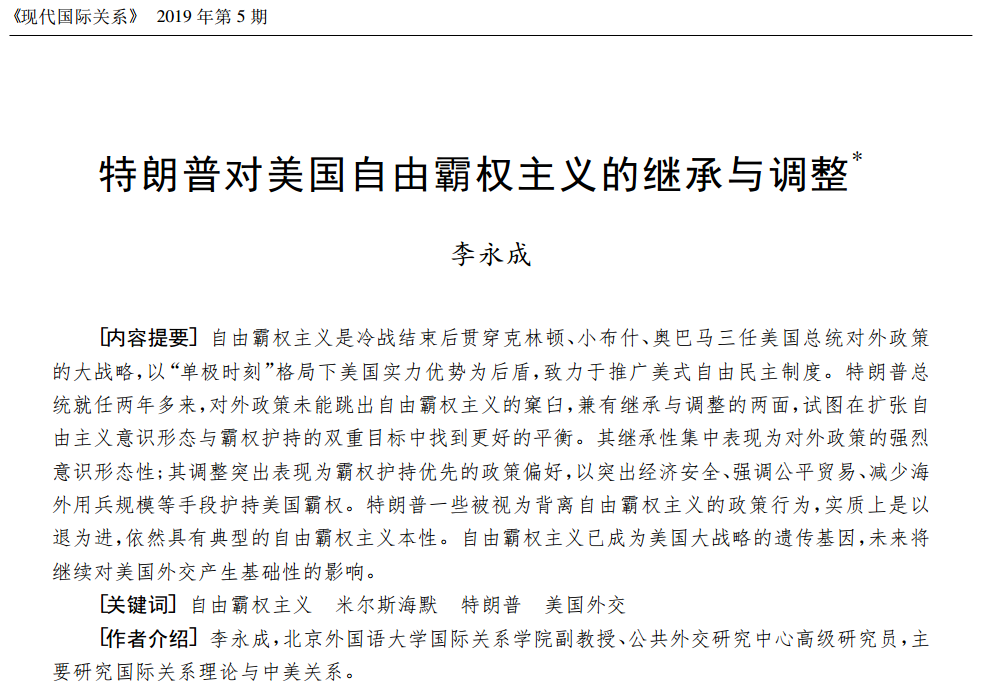 beats365vip官网登录入口李永成副教授在CSSCI期刊《现代国际关系》2019年第5期发表论文《特朗普对美国自由霸权主义的继承与调整》,论文摘要和原文链接如下: