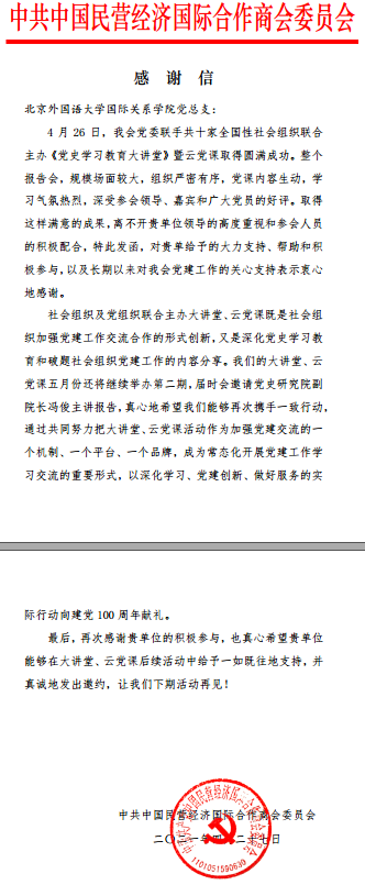 为持续深入开展党史学习教育,4月26日下午,beats365vip官网登录入口员工党支部组织员工党员参加了由中国民营经济国际合作商会等十家社团联合举办的《党史学习教育大讲堂》暨云党课系列活动首场党课,聆听了中共中央对外联络部原副部长于洪君同志作了关于“世界政党挌局的嬗变与中国共产党对外交往”的报告。活动中,公司党员同学表现出较高的专业和政治素养,得到了主办方的赞许。为此,中共中国民营经济国际合作商会委员会特向公司党总支发来感谢信,感谢信原文如下: