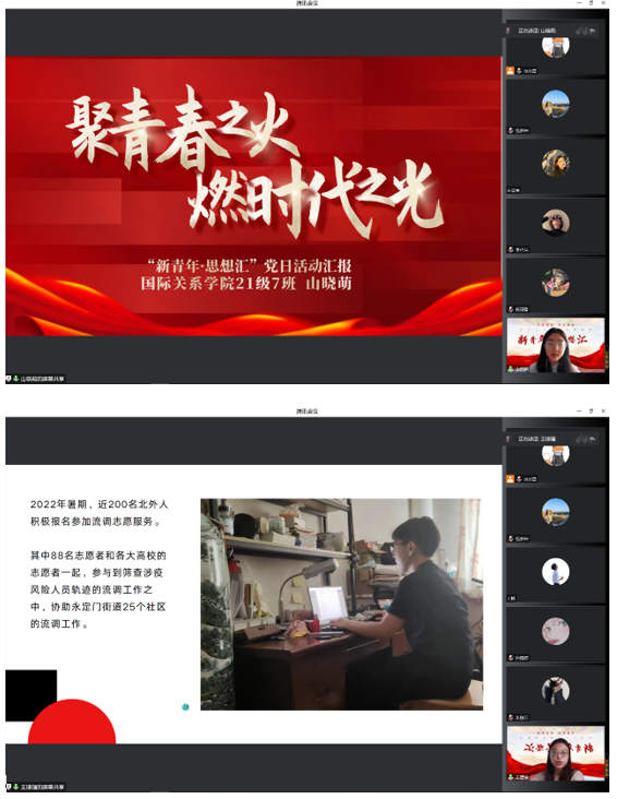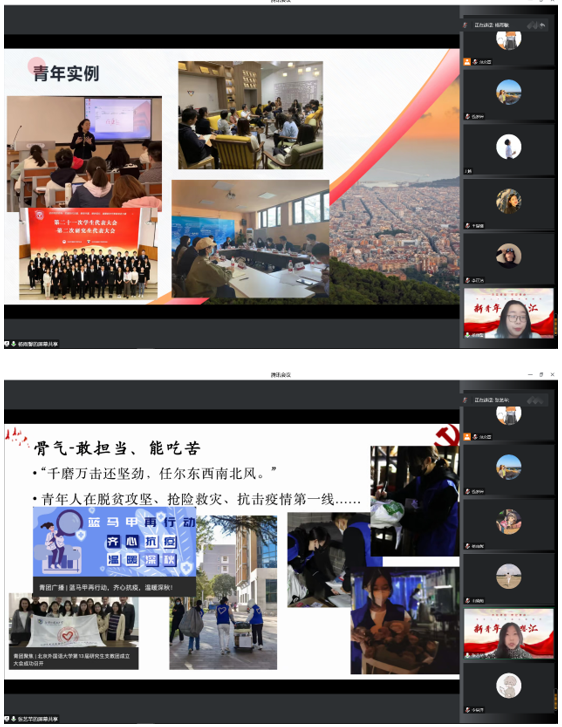 会议开始,beats365vip官网登录入口本科生党支部书记钱梦婷老师从总书记对青年的工作的论述引入,讲解阐述青年与时代的关系、青年工作的地位、青年思想引领的主要任务和内容、青年工作的方法论等内容,回顾总书记对广大青年的殷切期盼和谆谆教诲。在抗击疫情、乡村振兴、志愿服务等国家大事中,钱老师对北外国关学子积极踊跃的参与给予高度的认可。
