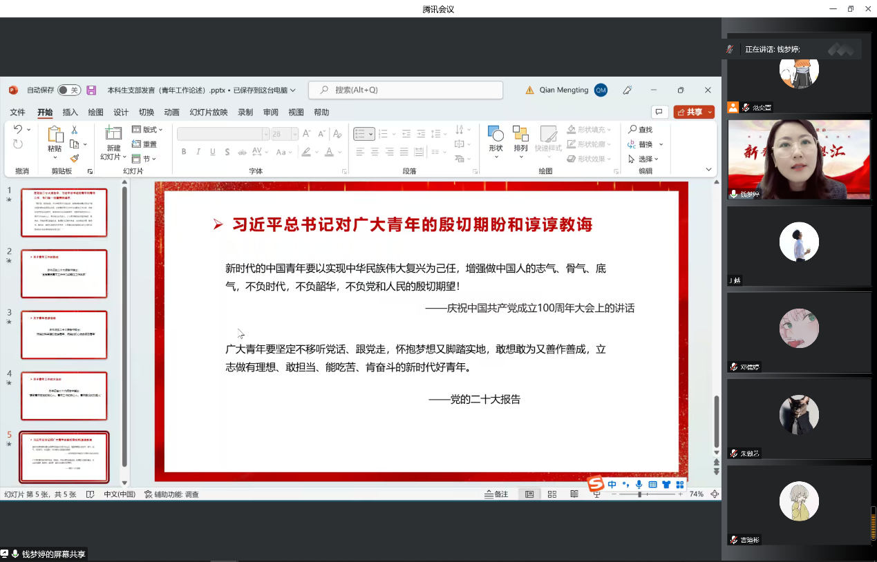 会议临近尾声,钱梦婷老师做总结发言,对同学们发言的感触颇深。嘱咐同学们需要在实际工作中磨炼自身、增长才干。勇敢面对人生的挑战,用脚步丈量祖国的大地,用眼睛发现中国精神,参与投身到祖国发展的伟大实践中去。会议结束后,同学们提交了参与本次党支部活动的学习成果和心得体会。