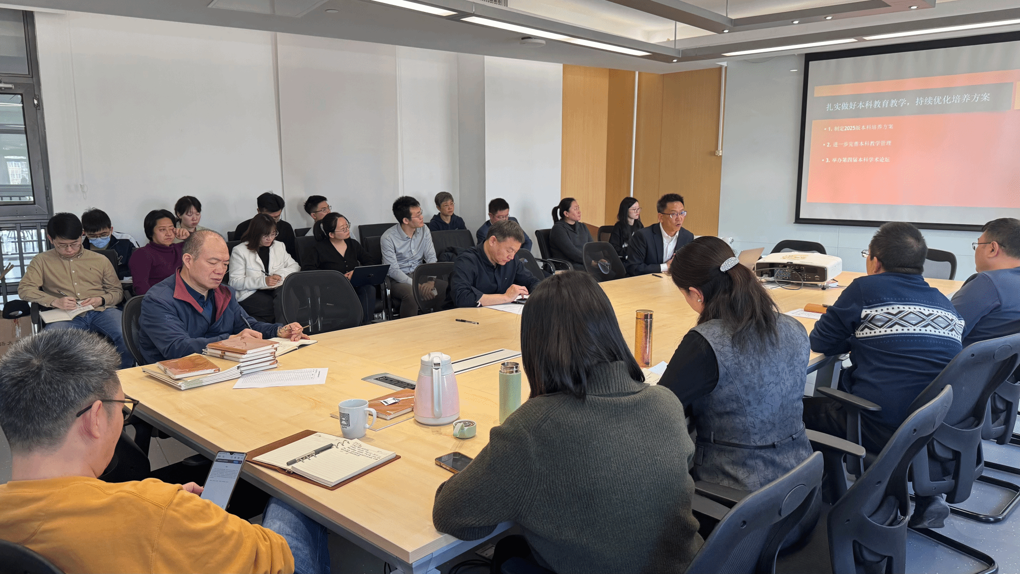 杨毅副经理主要就本科生期末考核方式调整、本科生毕业论文管理、本科培养方案修订、本科教学秩序维护、习近平外交思想课程开设等工作进行说明。